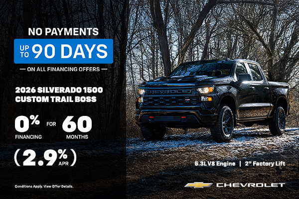* $150 instant rebate on the purchase of a set (4 tires) of Bridgestone Blizzak winter tires when you purchase, finance or lease an eligible 2024-2027 GM vehicle between January 3, 2026 to December 31, 2026. New retail vehicles only; purchase, finance or lease of used, certified pre-owned or fleet vehicles not eligible for offer. Eligible tires must be purchased at time of delivery of vehicle. Rebate is non-stackable with other Bridgestone consumer offers. Rebate applied before applicable taxes. Offer is subject to tire availability. No rain checks available. This offer may be changed, cancelled or extended at any time without notice. Conditions apply. See participating dealer for details.1 TIRE 30-DAY PRICE MATCH GUARANTEE: Your local dealer will match the competition's prices. If you purchase one of the aftermarket tire brands listed below and later find a competitive price on a qualifying brand within 30 days of the purchase, we’ll refund the difference. Tire Brands: BFGOODRICH, BRIDGESTONE®, CONTINENTAL, FIRESTONE®, GENERAL, GOODYEAR®, HANKOOK, KELLY, MICHELIN, PIRELLI, UNIROYAL, KUMHO, COOPER. The price match applies to the brands listed above. Competitive Prices: The competitive price you find must be in a valid ad, written estimate or Internet quote for identical, new tires. The tires must be an exact match in brand, tire line, size, load rating and speed rating to be eligible for the price match guarantee. All competitive quotes (including internet quotes) must come from a local competing tire retailer and installer (with a physical location within 100km of your participating GM retailer). The competitive price must be valid within 30 days of your purchase of any of the tire brands listed above. Service and Installation: The price match guarantee is only valid on the tire price and does not include installation/labour. Offer available to retail customers only at participating Canadian Chevrolet, Buick, GMC and Cadillac dealers. Offer valid from January 1, 2026 to December 31, 2026. GM Canada reserves the right to cancel, modify or amend the offer without notice. Conditions and limitations apply. May not be combined with other offers and programs.